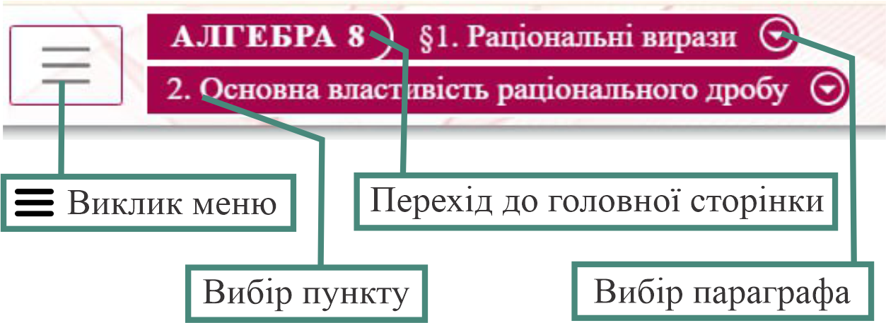 Вибір пункту: натискання на назву пункту відкриває перелік пунктів підручника та варіантів підсумкових завдань для вибраного параграфа. Це дає можливість перейти на обрану сторінку пункту або варіанта підсумкового завдання.