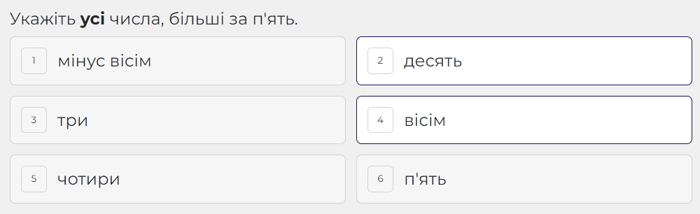 - Вибрати всі правильні (на вашу думку) відповіді. В умові буде зазначено, що потрібно вибрати всі правильні варіанти. Для того щоб скасувати вибір, потрібно повторно натиснути на нього.