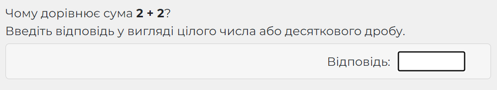 - Ввести відповідь. В умові буде вказано, в якому вигляді потрібно вводити відповідь. Зазвичай це ціле число або десятковий дріб, який необхідно ввести у віконце відповіді.