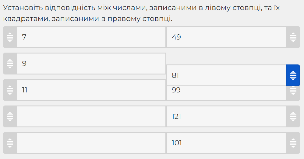 - Встановити відповідність між набором завдань та відповідей до них. Необхідно перетягнути кожну відповідь (або завдання, якщо вам так зручніше) так, щоб вона була розташована навпроти відповідного завдання. Зазвичай відповідей більше ніж завдань. Невикористані відповіді залишаться навпроти порожніх комірок.